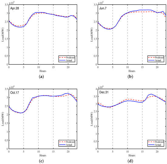 Predicted load and actual load for test days of PJM 2000. (a) Prediction for 28 April; (b) Prediction for 7 June; (c) Prediction for 17 October; (d) Prediction for 31 December.