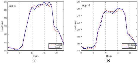 Predicted load and actual load for test days of the RSF building. (a) Prediction for 15 June 2011; (b) Prediction for 10 August 2011.
