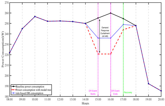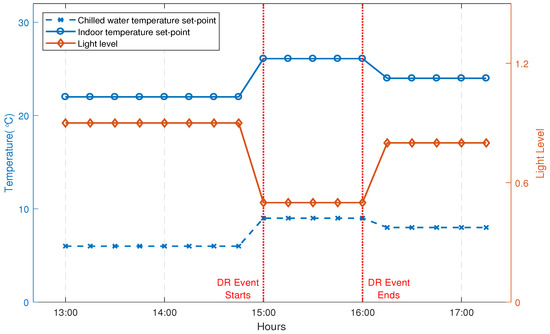 The RSF building is considered to participate a DR event on the 10 August, 2011 from 3:00 p.m. to 4:00 p.m. According to Algorithm 1 described in Section 4.4, a set of optimal control strategies can be obtained and the maximum reduction of load is provided. Firstly, the DR model tree is built on disturbance variables that contain weather, a time indicator and historical load from the building. Then, at each leaf node of the tree, a linear model is fitted by using controllable variables. There are three control variables to the designed system: the chilled water set-point, zone air temperature set-point and lighting level. During the DR event, a building management center determines the leaf that there is, and therefore, which linear regression model will be used on the basis of the disturbance inputs for that time slot. Then, solve the optimization problem in Equation (16) and determine the optimal values of the control variables to meet a sustained response while maintaining thermal comfort.