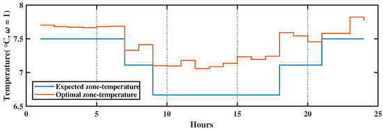 Based on the above algorithm, the optimal control strategy during the DR event can be obtained through solving the optimization problem expressed in Section 2.2. The objective of the optimization is to minimize the predicted power consumption . However, it is worth noting that the comfort of building occupants should be guaranteed while reducing energy consumption. Temperature and relative humidity are the main factors that influence a human’s thermal feelings [33,34,35]. The researchers indicated that the humidity has little effect on the occupants’ comfort when the temperature is under suitable conditions. In this paper, the relative humidity of the building is assumed to be kept within a stable range. Therefore, a thermal satisfaction method is adopted to account for thermal comfort. Similar to the discomfort management in [36,37], the deviation between the actual temperature and a desired set-point temperature is considered in our objective function. Then, the optimization problem in Equation (2) can be rewritten as follows: