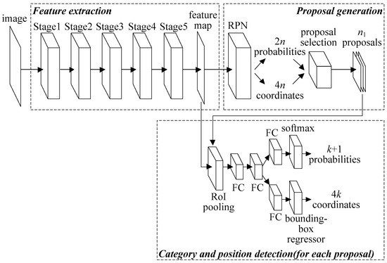 According to the introduction of [11], the architecture of Faster R-CNN is expressed as Figure 1, which can be divided into three modules: feature extraction, proposal (a box that may contain an object) generation, and category and position detection. Considering the requirement of accuracy and the scale of the data set in this paper, the ResNet-50 is selected as the convolutional neural network (i.e., Stage 1–Stage 5) in the feature extraction module [34]. As shown in Figure 1, an image is transformed into a feature map by 5-stage ResNet-50 firstly, and then the feature map is sent to a region proposal network (RPN) to generate n proposals, each of which has 2 probabilities of containing an object or not containing an object, and 4 coordinates encoding the proposal position. Finally, the feature map and n1 selected proposals are sent to region of interest (RoI) pooling, fully-connected (FC) layers and a softmax classifier/bounding-box regressor. After that, each of the n1 proposals has k + 1 probabilities of containing k categories of objects plus a “background” category, and 4k coordinates encoding k adjusted proposal positions of k object categories.