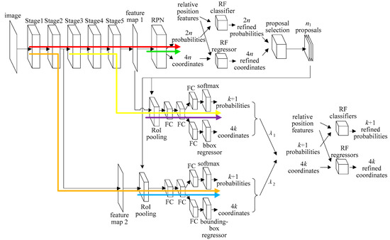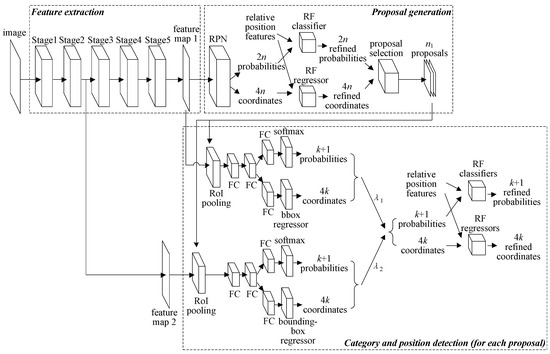 Based on Faster R-CNN, the improved model is proposed as shown in Figure 2. Compared with Figure 1, there are two main improvements of the architecture in Figure 2. The first one is to add the feature map of Stage 2 to the category and position detection module, which cooperates with the feature map of Stage 5 to adapt to the change of component sizes dynamically. The second one is to introduce relative position features between components to both the proposal generation module and the category and position detection module, and adopt random forests (RF) models to refine the probabilities and coordinates.