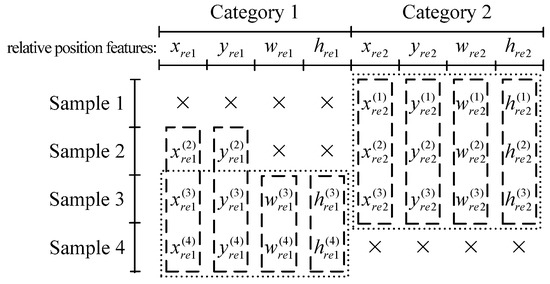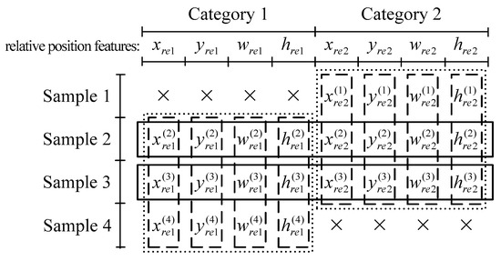 where a, a1, a2, L1, L2 and Gini(L) are the same meanings as those of Equation (9), but the training samples are assigned to the left or right child node according to l*(xre1, yre1, wre1, hre1) instead of x*re1. For the four features xre1, yre1, wre1 and hre1, there are still three available training samples (i.e., a = 3): Sample 2, Sample 3 and Sample 4. Similarly, the four features of Category 2 can be examined in the same way, so the available feature values are the ones in the boxes with dotted lines in Figure 3, with no feature values wasted.