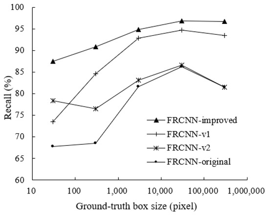 The differences in the component sizes and the shooting distances lead to the great change of the object sizes in the images. In the data set, the largest ground-truth box is 227,454 pixels, while the smallest one is only 48 pixels. Moreover, small objects are more difficult to detect [23], so a low-level feature map is necessary. To verify the advantage of double feature maps in adapting to the change of object sizes, the sizes of all the ground-truth boxes in the data set are divided into five intervals according to the order of magnitude. Then, the recalls of the four Faster R-CNN based models in different size intervals are evaluated; the results are shown in Figure 6.