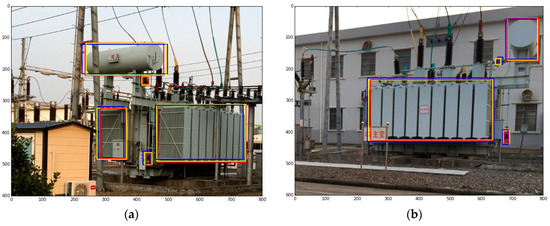 From the comparison of FRCNN-improved and FRCNN-v1 (or the comparison of FRCNN-v2 and FRCNN-original), it can be seen that the recalls of models with double feature maps are higher than the corresponding single-feature-map models, and the advantages are more obvious in smaller sizes. This is also why the models with double feature maps perform better on the three relatively small components in Table 5. The detection results of two images are shown in Figure 7 to give an intuitive illustration, in which the red boxes are the ground-truth boxes, the yellow boxes are the detection results of FRCNN-improved, and the blue boxes are the detection results of FRCNN-v1. In Figure 7a, FRCNN-v1 fails to detect the gas relay; in both the two images, the positions of breathers and gas relays detected by FRCNN-improved are more accurate.