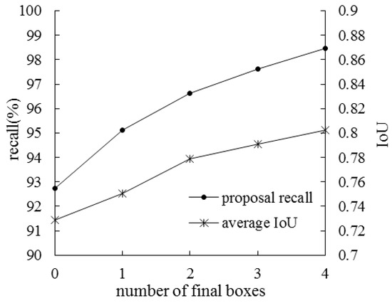 It can be seen from Figure 8 that as the number of final boxes increases (i.e., the number of relative position features increases), the recall of the proposals is improved, which indicates that the probabilities of the proposals are more accurate. Meanwhile, the average IoU is higher with more final boxes, which suggests that the accuracy of the proposal coordinates is improved.