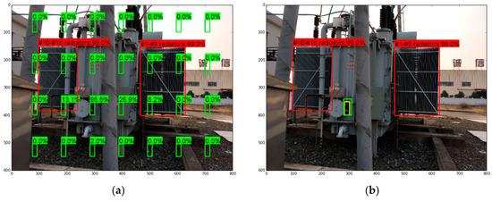 In the category and position detection module, the RF models’ refinement principles are similar to that of the proposal generation module, but the refinement is aimed at specific categories of components. Intuitive explanations are given in the two images in Figure 9. In both the images, we set that the #1–#9 radiator group and the #10–#18 radiator group have been detected, as the red boxes show. Then, in Figure 9a, we evenly select 4 × 7 boxes (the green boxes) of the same size as the breather of OLTC, and set that each box’s probability of containing a breather of OLTC is predicted to be 60.0% (the value of confidence_threshold) by the softmax classifier. After that, the probability and the position features relative to two radiator groups of each green box are input to the RF classifier, which then outputs the refined probabilities of containing a breather of OLTC, as the labels over the green boxes show. The refined probabilities indicate that, even if the neural network cannot distinguish the probabilities of different boxes, the RF classifier can still refine the probability of each box effectively through the relative position information, and select the correct final box with the highest probability.