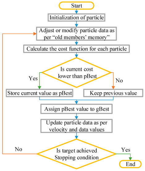 A brief introduction of the proposed strategy is described in the above paragraphs. The strategy is executed with the help of the PSO algorithm as summarized in Figure 3. The modification is done by limiting the search area. Limitation in the search area is done as per the electricity and natural gas network constraints. For example, for PV, the total expected generated power is calculated by getting weather forecasting information and using MPPT techniques. As this type of produced energy has no significant effect on operating cost, therefore, the PSO algorithm does not need to search the optimized solution because it is already known and the expected calculated power is used in the simulation (Figure 3, step 3). Kennedy [30] introduced the PSO for the first time back in 1995. Later, some modifications have been done in different aspects of the PSO algorithm. Shi [31] added a new variable inertia weight. In [30], Kennedy described that the PSO is based on the observation of natural swarms’ behavior, i.e., a school of fish or a flock of birds. It can be implemented easily. In this algorithm, there are total three global variables; (1) gBest, the best global available solution; (2) stopping criteria and (3) condition or target. This algorithm depends on imaginary particle moments. Each of the particles has three values: (1) the best valid (pBest) solution; (2) velocity and (3) the best local value. Further, there are many topologies for the particles to communicate with each other. The topology used in the algorithm implemented in this article is called fully connected. In this topology, every particle is connected to each other.