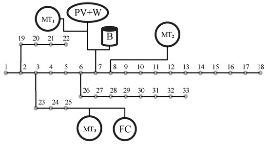 The simulation was done on an IES having a 7-node natural gas system coupled with the IEEE bus 33 test system. The structure for these networks can be seen in the following Figure 5 and Figure 6. The electricity network parameters are given in Table 1, and the natural gas network parameters are given in Table 2. This study is focused on a residential microgrid.