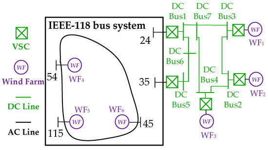 6 were directly connected to the AC grid at bus 54, bus 115, and bus 45, respectively. The parameters of the IEEE 118-bus system can be found in Matpower 6.0 as in reference [