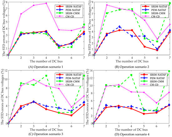 Figure 3, that the relative errors obtained using SRSM-NATAF and PEM-NATAF were much smaller than those obtained using SRSM-CMM. For example, in operation scenario 2, the STD errors in the DC bus voltage obtained using SRSM-NATAF, PEM-NATAF, and SRSM-CMM were 3.02%, 3.3%, and 6.08%, respectively. Meanwhile, in operation scenario 3, the STD errors in the DC bus voltage were 3.41%, 3.88%, and 7.38%. SRSM-CMM cannot accurately consider different correlated distributions, resulting in a decrease in the computational accuracy of the PLF calculation. However, the proposed SRSM-NATAF method could solve this problem. It is of value to note that the calculation errors obtained using SRSM-NATAF were smaller than those obtained using PEM-NATAF.
