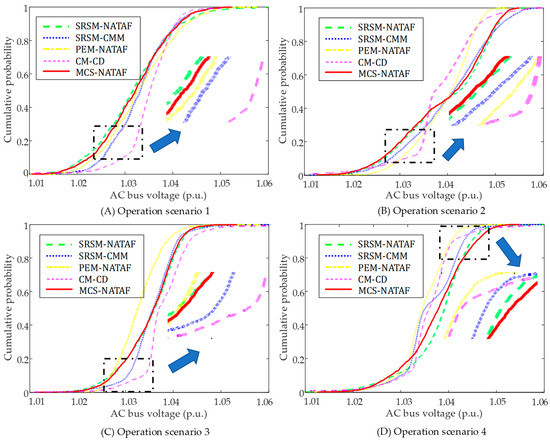 Figure 4, the cumulative probability curves obtained by CM-CD and PEM-NATAF in operation scenarios 3 and 4 were evidently biased when the probability was near 0 or 1. The key reason lay in that SEMs, like the Gram–Charlier series, may become unreliable when the probability was near 0 or 1 [