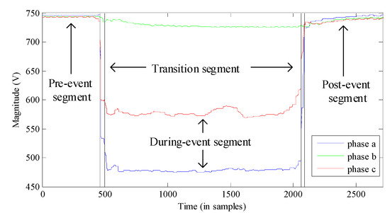 In the past, voltage sag was described as a two-dimensional electromagnetic disturbance [3], and magnitude and duration were acknowledged to be basic characteristics. As illustrated in Figure 1, for a typical voltage sag waveform, the voltage magnitude always changes abruptly from being three-phase-balanced with a nominal magnitude to being unbalanced with a low magnitude, and then, finally, recovers to a balanced nominal magnitude. Therefore, this pattern of change in magnitude means that waveforms can be separated into distinctive parts, i.e., pre-event, transition, during-event, and post-event segments [7], as shown in Figure 1. Each one is, in general, relatively stationary except for the transition segment. As a result, different statistical characteristics in each segment can be obtained to describe voltage sags in more detail. Moreover, more information about the origins and impacts of sag events can be extracted.