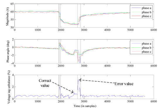 For segmentation, the voltage magnitude and phase angle values during the transition segment are influenced by the calculation method and typically not realistic. Therefore, values in the transition segment should be excluded before calculation. As shown in Figure 2, the maximum voltage unbalance during a sag event is calculated as an example. If transition segments cannot be detected, it would result in the wrong result (more than 3% unbalance instead of 1%). The impacts of segmentation on other characteristics can be found in some published works, where segmentation is considered to be an unsolved problem [9,10]. In general, the inaccuracy of segmentation sometimes may result in an unacceptable error in the characteristics calculation. Another example can be found in the classification of a voltage sag event’s origin [13], where the transition segment can be used to classify the origins of sag events. If the number of transition segments is inaccurate, the classification results are invalid. Overall, a further analysis of sag events and related conclusions would be affected by the segmentation method.