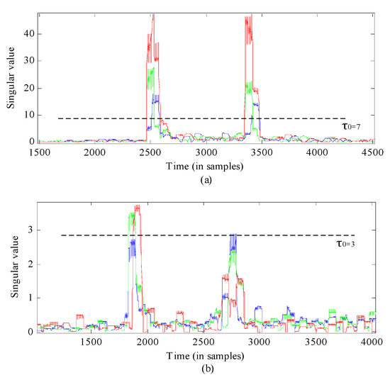 Due to the stochasticity of voltage sags, the dynamic variation of magnitude has a significant impact on singular values. As the threshold value τ0 (dashed lines) shows in Figure 6, if τ0 in Figure 6a is less than seven, more transition segments would be detected (false alarm), while if it is larger than three for another waveform in Figure 6b, there would be only one segment or even zero (a miss alarm). Overall, the reasonable constant threshold for one recorded waveform may be unavailable to another one. From a practical standpoint, it is impossible to change the threshold value for different sag events at different monitoring sites in an artificial way. This is the primary reason for why there is no acceptable automatic segmentation method.
