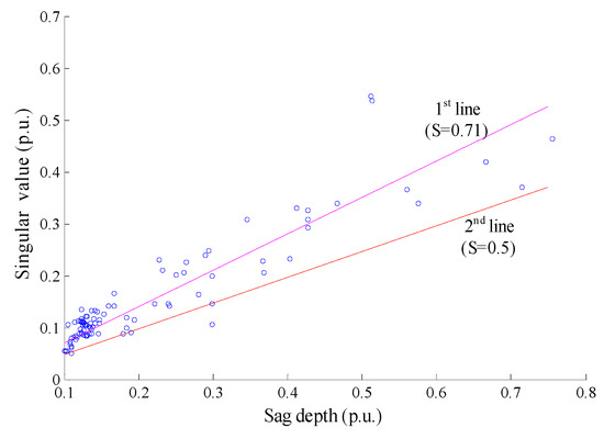 In Figure 7, most points are close to the left side where the sag depth is between 0.1 and 0.2, because most sag events recorded in a distribution system have a slight voltage drop. In addition, it is noted that singular values are related to the sag depth (the first line). The reason is that the maximum singular value represents the largest rate of change (a differential waveform of voltage magnitude is taken as the input signal in MRSVD), which can be approximately considered as the proportion of sag depth. For the same sag depth, if the voltage decreases more quickly, the singular values are larger. Although different sag events may have different rates of voltage decrease (the ratio of Y-axis to X-axis of each point is different), most of them distribute in a small range (since the cases in which the voltage changes continuously during the entire sag event are not considered). To make sure that transition segments in different sag events can be detected, the threshold value should be below most points, but not too much to avoid false alarms. Therefore, the second line in Figure 7 indicates that the threshold should be nearly 0.5 times the sag depth. It is noted that this is just a rough value, and further steps are required to detect the outliers. In general, the sag depth helps us to first select a threshold in an approximate range.