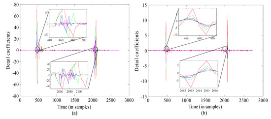 MRSVD and WT were utilized to decompose the same waveform shown in Figure 4a and the detail coefficients of each decomposition level are shown in Figure 9. In our experiments, the “Db 4” mother wavelet and five decomposition levels were used. The detail coefficients of each decomposition level shown in Figure 4c–e are plotted in one figure, so it is easier to compare the instants of peak values.