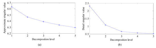 It is validated that MRSVD can effectively reduce the noise of the input signal with an increase in the decomposition level. The reason is that, in the Hankel matrix of Equation (4), the data of the 1st row correlates with the data of the 2nd row. Therefore, the energy is distributed mainly to the larger singular value. In contrast, the energy of the noise is distributed equably between the two singular values, that is, most of the noise energy is eliminated by decomposition. To further verify this property, the maximum detail singular values at each decomposition level are shown in Figure 11. It can be seen that energy of the noise is related to the detail coefficients. From Figure 11b, the decrease in singular values gradually slows down with the increase in decomposition level. This means that most of the noise energy is eliminated in each decomposition.
