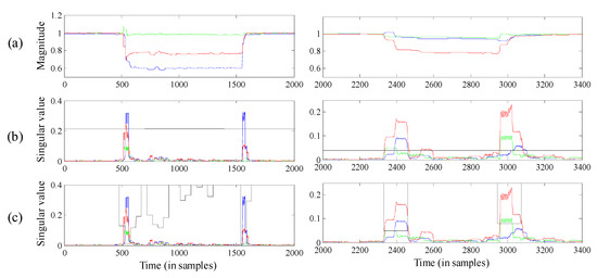 From Figure 9a, the peak values vary at each level in WT, i.e., the singular points would shift with an increase in decomposition levels. Actually, similar to the case of the detail coefficients, the singular points of the approximate coefficients at each decomposition level would also shift in WT. To limit the length of the paper, the approximate coefficients are not shown. The shifting singular point would change the boundaries of transition segments and, furthermore, the characteristics in each segment would be different. For MRSVD, the singular points in Figure 9b do not shift, which helps us to more easily detect singular points, i.e., the boundaries of transition segments.