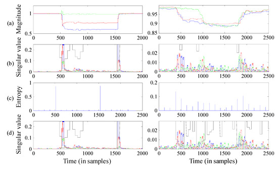 For a distribution system, there are a few cases in which the voltage drops in transition segments are very slight due to the monitoring sites being far away from the sag sources. In these cases, the MSE in Equation (18) would be less than 1 in a transition segment; correspondingly, an increased threshold value would result in a miss alarm. It will be difficult to distinguish transition segments from other disturbances in a stationary segment based on the time-domain features of the waveform. Therefore, considering the property of the multi-resolution analysis of MRSVD, entropy is introduced to correct the threshold value obtained in the second step in this work. Similar to the multi-resolution analysis with the wavelet transform, the entropy is used to evaluate the disorder and uncertainty of sag events in the time-frequency domain [25,26]. The entropy of singular values is calculated as: