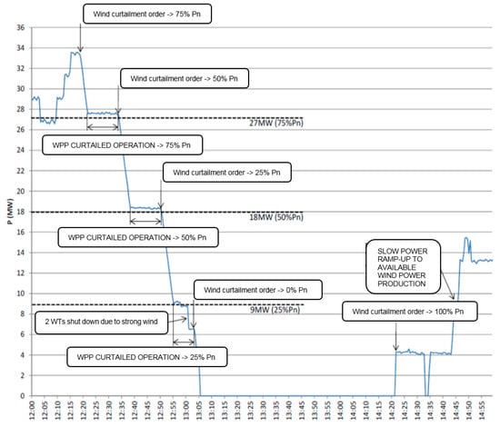 - Variable wind power plant active power production change in an interval from 0–100% of rated power in discrete steps of 25%;