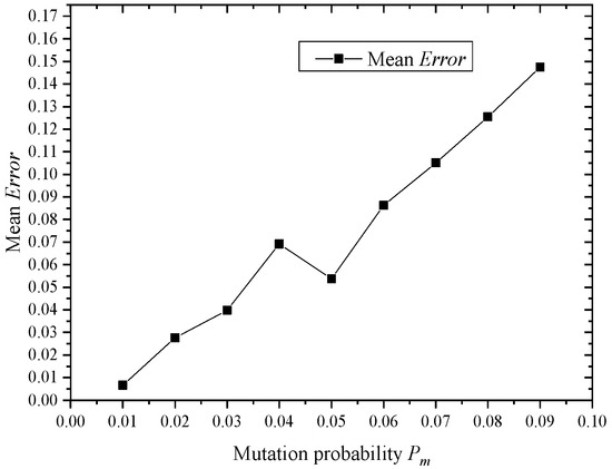 First, the pc is set as 0.8 and the pm varies from 0.01 to 0.09. The mean Error values of the 45 cases with different pm are plotted in Figure 5. As we can see, the small value of pm generally performs better than the large value of pm. That may because the larger pm destroys the convergence ability, which makes the algorithm act like a random search and cannot converge to a promising region. Therefore, the investigated results indicate that the DGA obtains the best performance when the pm is set as 0.01.