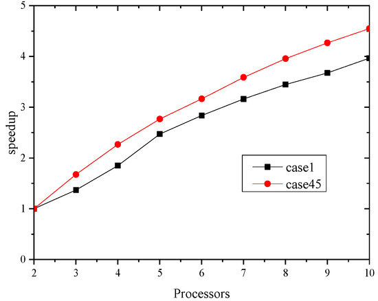 Speedup ratio is the metric to measure the performance of a distributed or parallel algorithm, and it varies with the numbers of processors and the computation cost of the case. Herein, we use the small-scale case 1 and the large-scale case 45 as two representative instances. We test the speedup of DGA on these two cases and draw the speedup curve with the increasing processors, from 2 to 10, shown in Figure 7.