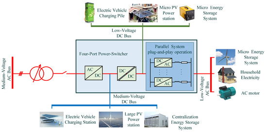 Grid-tied distributed generation, microgrids, and variable loads are increasingly being utilized for power distribution. A key requirement for a distribution grid is a flexible connection mode [1,2,3]. In a hybrid AC/DC distribution grid, not only can a power switcher realize voltage isolation and voltage class conversion, it can also satisfy the flexible power supply requirements for medium- and low-voltage AC/DC loads. Consequently, the power switcher requires multi-voltage levels and connected ports to meet different electrical power demands. As a result, the multi-port power switcher has become an attractive device for use with a smart distribution grid to guarantee power quality, realize multidirectional power flow control, and offer energy management services [4]. A distribution grid system connected by a four-port power switcher is shown in Figure 1. It can be seen that micro-photovoltaic generation plants, micro-energy storage systems, micro-wind turbines, and so on, are connected to the low-voltage DC and AC power system. Therefore, a plug-and-play functionality needs to be considered for governing the unpredictability of plug loads, load extraction, and distributed generation. To this end, the parallel structure of a low-voltage DC/AC converter system is gaining increasing attention [5,6,7], as it combines the functions of both energy conversion and the ability to govern arbitrary changes in loads and distributed generation. Furthermore, the rated power of the converter system can only increase or decrease by changing the number of paralleled converters. Owing to these features, low-voltage DC/AC converters with a parallel structure for distributed generation have been attracting increasingly more interest in recent years.
