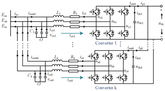 The main structure of the parallel system is shown in Figure 2. There are k converters in parallel that connect the common AC system and DC system. L k , R k , and C k are the inductance, resistance, and capacitance of the k th converter; i x k , i x o u t k , and v c x k are the inner current, output current, and output voltage of phase-x ( x = a , b , c ) in the k th ( k = 1 , 2 , , n ) converter; u x k is the voltage generated by the k th converter; E s x denotes the AC system voltage; i o x k is the circulating current in the k th converter.
