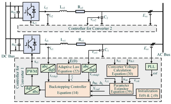 Figure 3. Block diagram of the adaptive backstepping control strategy with an OPE for a two-converter system.