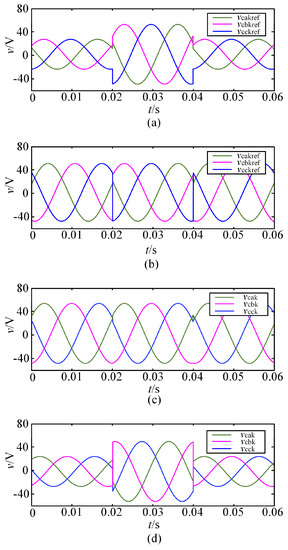 Figure 4. Voltage reference: (a) v c x k r e f , amplitude step changes; (b) v c x k r e f , phase step changes; (c) v c x k r e f , frequency step changes; (d) v c x k r e f , amplitude, phase, and frequency step changes simultaneously.
