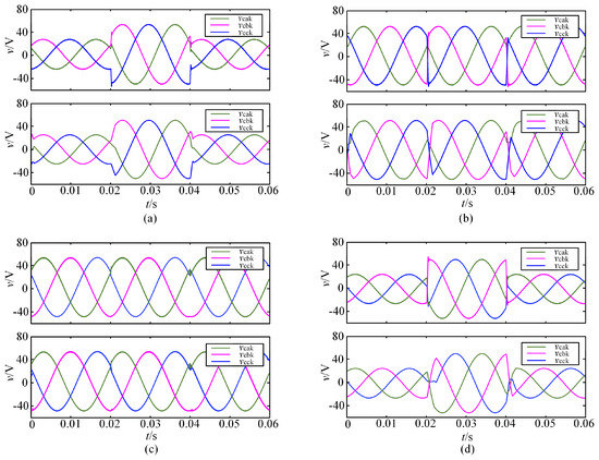 Figure 5. Voltage v c x k transient tracking performance: (a) with (upper) and without transient tracking performance control (TTPC) for amplitude step changes; (b) with (upper) and without TTPC for phase step changes; (c) with (upper) and without TTPC for frequency step changes; (d) with (upper) and without TTPC for amplitude, phase, and frequency step changes simultaneously.