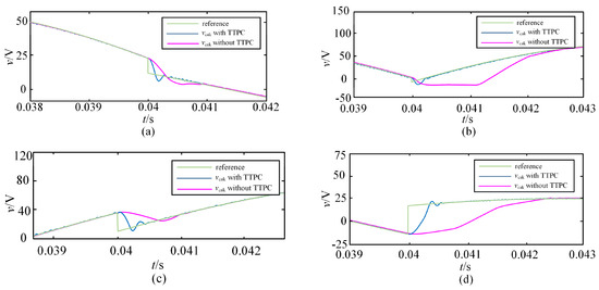Figure 6. Detail of voltage v c x k transient tracking performance at t = 0.04 s: (a) with and without TTPC for amplitude step changes; (b) with and without TTPC for phase step changes; (c) with and without TTPC for frequency step changes; (d) with and without TTPC for amplitude, phase, and frequency step changes simultaneously.