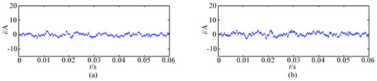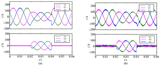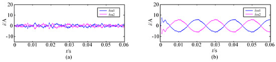 From Figure 7, we can observe the circuiting currents of Phase a in the two-converter parallel system for Converter 1 (a) and Converter 2 (b). The circuiting currents in three phases of one converter are the same, i oa 1 = i ob 1 = i oc 1 and i oa 2 = i ob 2 = i oc 2 . Furthermore, the circuiting currents are opposite in Converter 1 and Converter 2, which demonstrates the correctness of Equation (2).