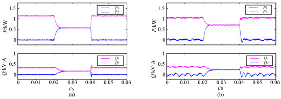 Figure 10. Dynamic process of plug-and-play: (a) active and reactive power with the OPE; (b) active and reactive power without the OPE.