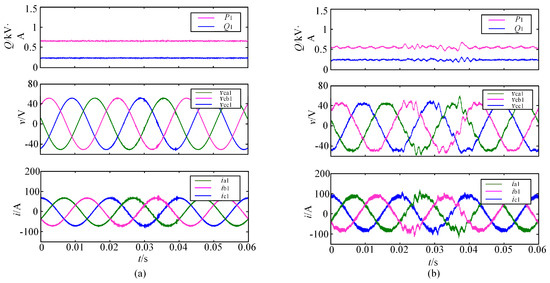 The adaptation for the unknown disturbance ξ is verified in Figure 11. Initially, the unknown disturbance is 5% of the DC voltage. At 0.02 s, it increases to 50%. At 0.04 s, it reverts to the initial state. The responses of active power and reactive power, v c x 1 and i x 1 , respectively, are shown. Obviously, by using the update law in Equation (22), the influence of the unknown disturbances is reduced effectively. Even suffering from a 50% disturbance, an acceptable performance is achieved in (a). In addition, the total harmonic distortion (THD) from t = 0 s to t = 0.02 s is 0.27% and 2.80% for voltage and current when using the update law in Equation (22), while it is 3.51% and 7.52% for voltage and current when not using the update law. Similarly, the THD from t = 0.02 s to t = 0.04 s is 1.46% and 5.85% for voltage and current when using the update law in Equation (22), while it is 9.35% and 11.49% for voltage and current when not using the update law.