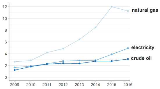 The proposed approach to construct indicators of adaptability of the economy to changes in energy prices should be explained by the example of an individual enterprise that consumes a certain type of energy resources. We choose two consecutive time intervals–base and reporting. We suppose that the price for this type of energy resource has a tendency to increase. Then, the enterprise’s costs for this energy resource would increase in proportion to the increase in its prices in the situation when the value of all other indicators of the internal and external environment of the enterprise remained at the basic level in the reporting period. Accordingly, its operating profit would decrease by the same value that we would name “the potential losses of the enterprise”. Decrease of operating profit to a lesser extent or even its increase would indicate a certain adaptation of the enterprise to the growth of prices for this energy resource. Under such conditions, the level of this adaptation could be estimated by the ratio of potential loss of profits that the enterprise avoided thanks to adaptation to the overall volume of these potential losses: