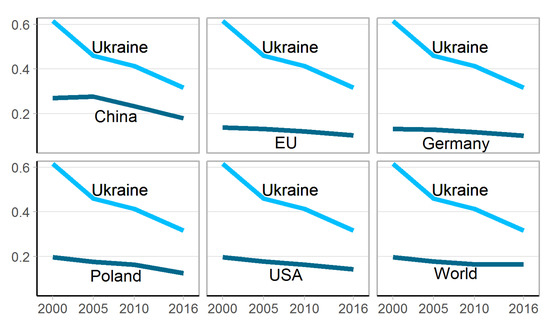 It is possible to obtain more accurate results. In order to do this, the weights in Formula (4) for calculating the values of the index Iv can be changed from prices for products to the corresponding monetary costs per unit of production. Then in Equation (4), where the index Iv is used three times, its values would be somewhat different all three. Accordingly, Equation (7) would be slightly modified. It is advisable to consider these particularities if the level of an individual enterprise is investigated and, accordingly, there is a sufficient array of necessary information. However, at the level of national statistics, at least for the case of Ukraine, the sectored values of the index of physical volumes of sales can only be obtained through the use of price weights.
