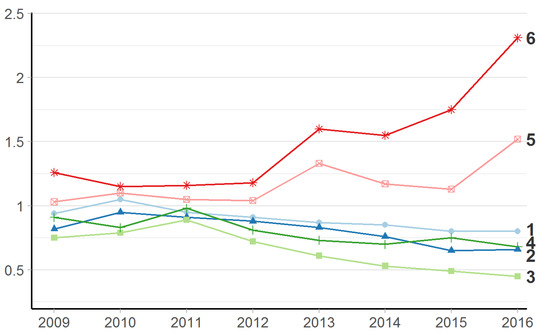Note that the index d in Equation (11) is calculated by subtracting a unit from the energy resources price index, which appears in Equation (4), that is, d = Ipe − 1.