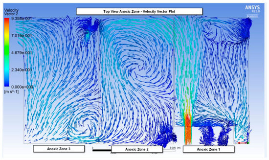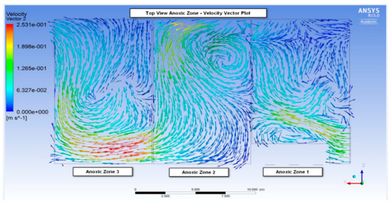 The streamline path plot further highlights regions within the three anoxic zones which experience a velocity less than recommended, while including the performance of the submersible mixers. The streamline path plot shows that across the three anoxic zones, the location of the submersible mixers is outside of the prominent flow path. It is within these regions where the velocity is less than 0.3 m/s as seen in Figure 9 and Figure 10.