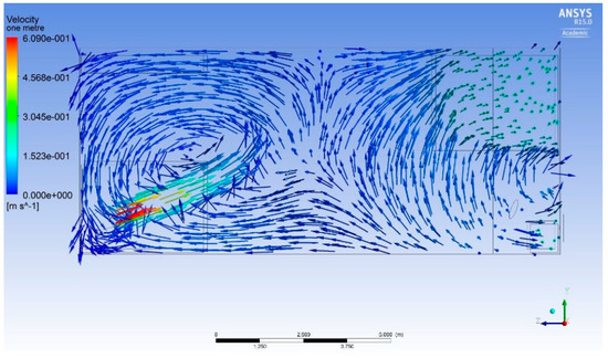 The velocity vector plot in the ZY plane in anoxic zone 3 illustrates the direction of flow from the submersible mixer and the influence of the prominent flow path. The region below the mixer experiences low velocity of approximately 0.1 m/s and therefore settlement of micro-organisms may occur in this region as seen in Figure 8.