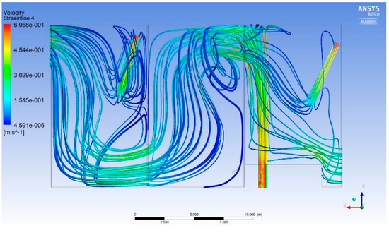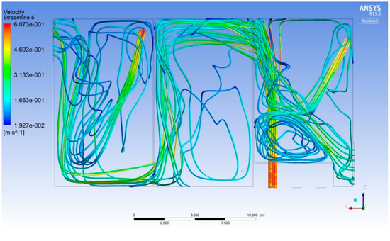 A simulation was performed which had the mixers in zone 1 and 3 operator for 150 s (2.5 min). The streamline path plots illustrated that the flow from the mixers was more prominent than that of the 900 s simulation as shown in Figure 12 and Figure 13.
