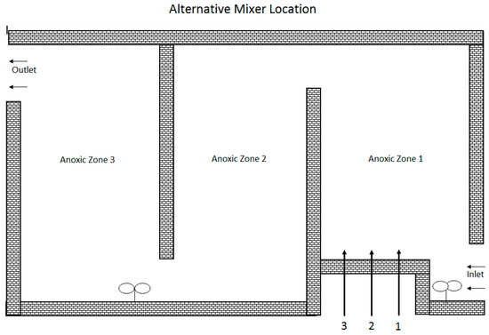 Each anoxic zone contains one 7.6 kW submersible mechanical mixers. The mixers are generally located 1 m above the floor and directed toward the opposite corner of the zone at 20 degrees above horizontal. Mixers are configured for intermittent operation for 15 min on and 15 min off. The succeeding zone mixers will alternative on and off times.