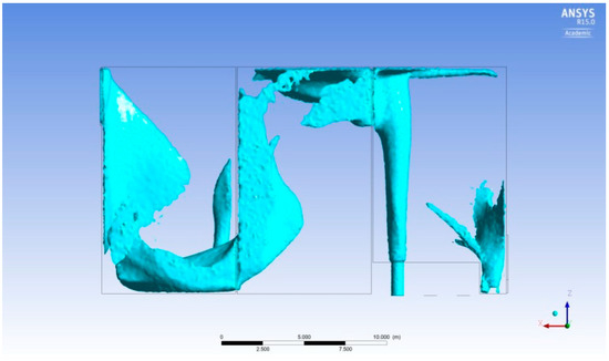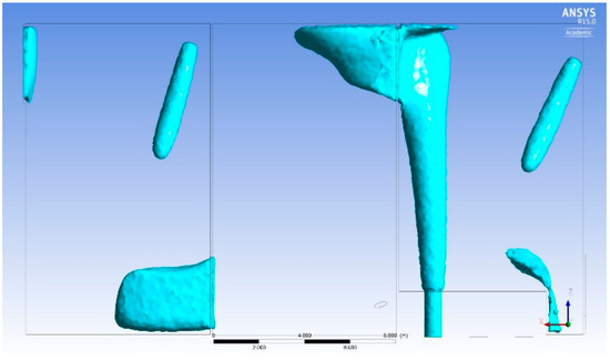 The three-dimensional model was constructed with the default meshing options and then each of the function of the model were named accordingly, for example, walls, inlet, A-recycle pump, mixers and outlet. The inlets are denoted in yellow, mixers are denoted orange and the outlets are denoted in green as shown in Figure 3. The inlet to anoxic zone 1 and 3 is via a 3.5 m × 2.72 m opening located at the top of the zone and via a 0.8 m × 3.5 m opening located at the bottom of the zone. The outlet to anoxic zone 1 and 3 is via a 3.5 m × 2.72 m opening located at the bottom of the zone and via a 3.5 m × 0.8 m opening at the top of the zone. The A-Recycle pumps are 0.8 m in diameter located 0.75 m of the bottom water level and the mixers are 0.58 m in diameter located 1 m above the bottom water level and are positioned facing the opposite corner and angled 20° above horizontal. The three-dimensional model mesh independence was based on previous work completed by Elshaw et al. [15].