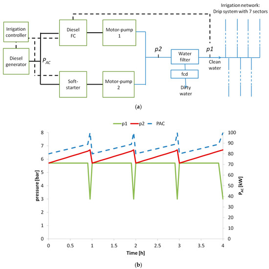 The yearly and daily evolution of the electric power requirements of the irrigation system needs to be deeply understood to address the PV system design. The pre-existing system (Figure 1a) was made up of two centrifugal pumps (Caprari MEC-MRS 100-2D 45 kW) fuelled by a 250 kVA diesel generator through a soft-starter and a 55 kW frequency converter (FC). The power of the diesel generator changes from year to year because it is rented to an external company that provides different models according to the availability. This is the reason for its oversized power. The farm has no access to the grid, so the electricity is only provided by the diesel generator.