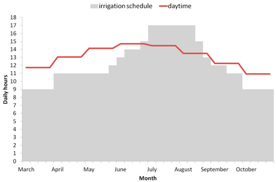 On the other hand, the pipe network is divided into seven different irrigation sectors covering areas corresponding from 27 ha to 30 ha and requiring water flows from 217 m3/h to 244 m3/h. The irrigation period (IP) is typically from May to October. Each day, every sector is activated sequentially and consequently the water flow varies from 217 m3/h to 244 m3/h following a timetable which is drawn up weekly by the operator responsible for the irrigation in accordance with the water needs of the olive trees (related to the difference between the evapotranspiration and the rain). It must be understood that, for a given volume of water, the irrigation time is a consequence of the section of the pipe network. This is implemented practically by means of an irrigation controller (Agronic 4000, from the Spanish company Progrés, Lleida, Spain), which automatically commands the shifts of the irrigation sectors and the diesel generator. This way, the daily irrigation time varies from week to week and the PAC required varies throughout the day in accordance with the different water requirements of the activated sector (this variation is in addition to the cycling behaviour due to the filter cleaning system). The key information to bear in mind is that, apart from the power peaks associated to the filter cleaning requirements, the PAC varies from 70 kW to 80 kW of stable power due to the different power demands of the sectors. The intensive cultivation of olive trees usually has its maximum water demand in July (around 500 m3/Ha), which obliges the irrigation operator to schedule approximately 2.5 h of irrigation per shift, per day. The irrigation lasts 17 h/day during this month, longer than the daily sun hours. Figure 2 shows an example of the weekly irrigation scheduling for a typical year. The figure also shows the sunlight hours, which are sometimes shorter than the irrigation schedule. This is the main reason for using a hybrid, i.e., not only PV, irrigation system.