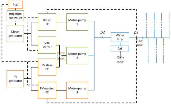 Second, hybridization in the hydraulic part of the system was implemented (to reduce as much as possible the operation of the diesel motor) by means of a 140 kWp PV generator, a new pump identical to the pre-existing ones (motor-pump 3), and two additional 55 kW FCs (two Omron 3G3RX-A4550 acting as PV master FC and PV slave FC), as Figure 3 shows. A contactor was added to enable the change of energy source of the motor-pump 2 that can now be fed by the PV or diesel generators. We have also implemented an emergency button to allow the quick disconnection of all this new equipment, thus restoring the original “only diesel” configuration to obtain the confidence of the irrigator operator. This third pump could be avoided, but it allows a better uniformity of the irrigation in the transition between operating modes, a requirement strongly required by the irrigation operator, even though this additional pump barely affects the economic feasibility of the new system.