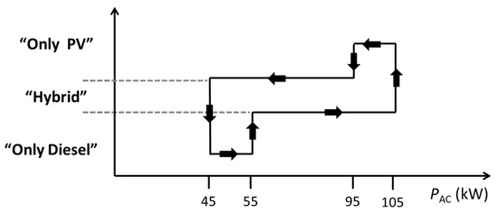 Third, to maximize the use of PV energy and therefore to minimize the diesel consumption, three operating modes were available: “Only PV” (Pumps 1 and 2 fed by the PV generator), “Hybrid” (Pump 1 fed by the PV generator and Pump 3 connected to the diesel generator), and “Only Diesel” (Pumps 2 and 3 fed by the diesel generator). Table 1 includes the ON/OFF status of the main components of the system in each case. The rotation between these modes follows the dynamics of the PV power available in accordance with the threshold values established in Figure 4. In practice, the ISC and VOC of a reference module are used for measuring the PV operation conditions: In-plane irradiance, G, and cell temperature, TC. Then, the available PV power at the output of the FC, PAC, is calculated [42] by a dedicated programmable logic controller (PLC) as: