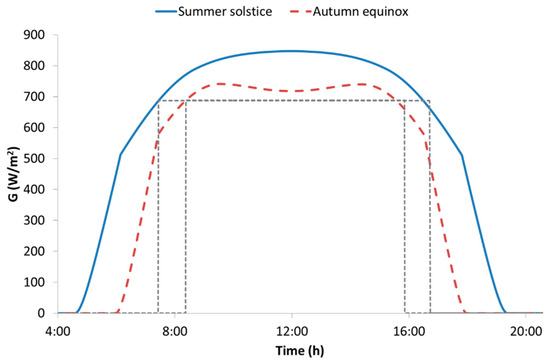 Second, the size of the PV generator was selected so that on clear days, the PV generator suffices for powering all the irrigation system at midday on the equinox days, which is used as the limits of the irrigation period. Figure 6 shows the daily profile of G, for the equinox and for the summer solstice. Note that due to the irradiance profile of this tracker, G remains equal to or larger than the midday value, Gmd, during 9 h in the equinox and 11 h in the summer solstice. Then, assuming the irradiance on a surface perpendicular to the Sun is G* = 1000 W/m2 and ignoring the diffuse component, the Gmd on these days is given by: