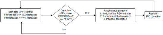 FCs in PV irrigation systems usually have routines for tracking the maximum power point voltage of the PV generator (that is the same as the voltage of the DC bus of the FC) to maximize PV production [18,44,45]. Furthermore, they control the operating voltage of the PV generator and the frequency of the centrifugal motor-pump with a proportional-integral-derivative controller (PID) [46]. The DC voltage was regulated to have the maximum output frequency. The PID parameters were tuned to allow a stable and fast response against changes in the available PV power [44]. This tuning is a balance between a fast response and stability: The faster the response, the greater the probability of having instabilities when the available PV power changes. So, when, for example, a cloud passes over the PV generator, producing an intermittency in the PV power, the PID controller may not be fast enough and a specific algorithm is needed to avoid the instability and its corresponding abrupt stop of the FC and the associated water hammers and overvoltage between the frequency converter and the motor-pump, which reduces the lifetime of the system [37]. The control algorithm consists of the following steps: